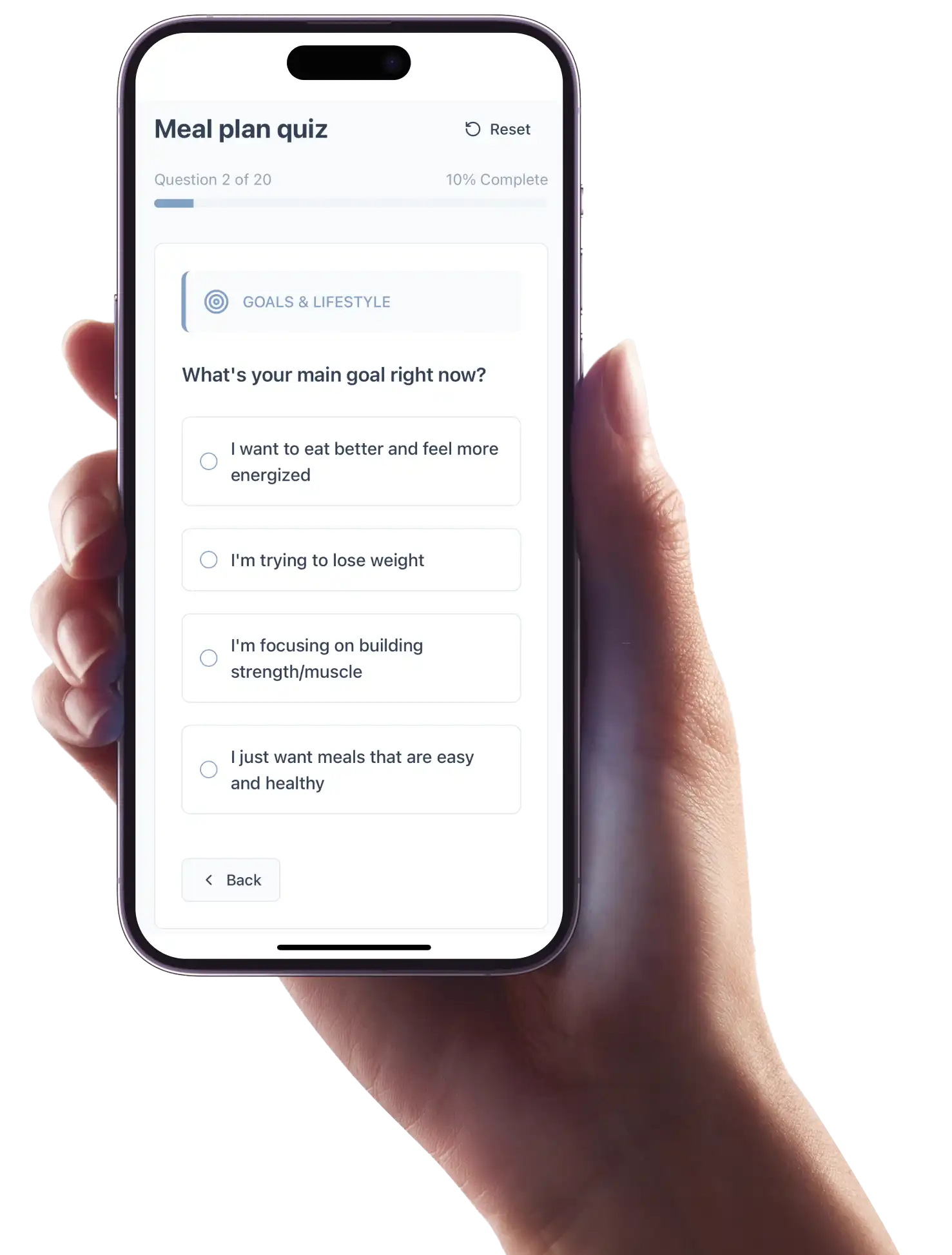 Faça o nosso questionário rápido para descobrir refeições, dicas e estratégias de nutrição que se adaptam ao seu gosto, objetivos e estilo de vida – para que comer de forma saudável seja fácil todas as semanas.